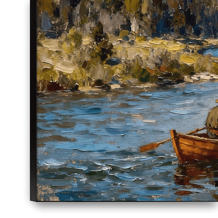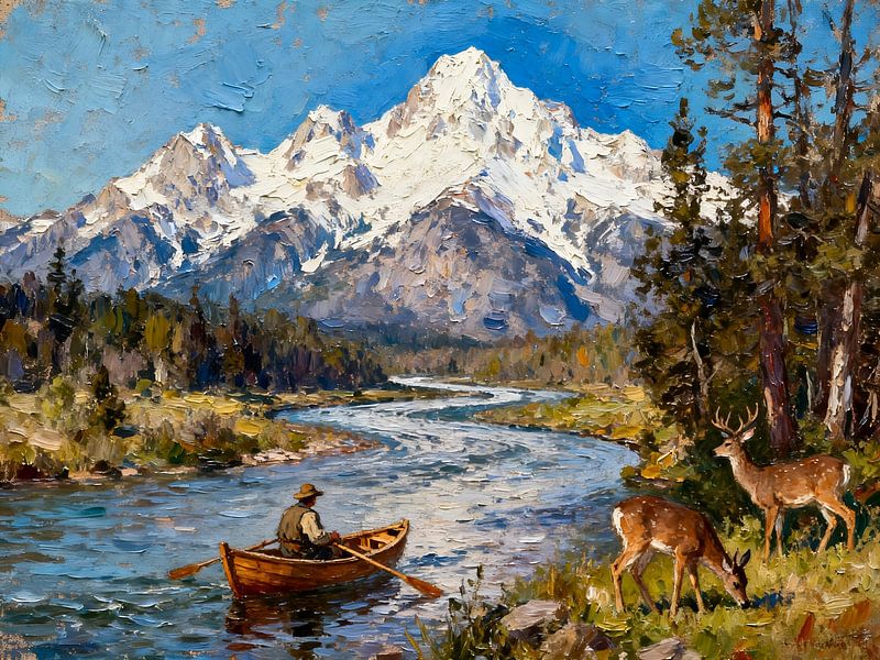 Dieses detailreiche Naturbild zeigt eine idyllische Flusslandschaft mit majestätischen Bergen im Hintergrund. Ein Mann sitzt in einem kleinen Boot und gleitet ruhig über das Wasser, während am Ufer Hirsche grasen. Die Szene vermittelt ein Gefühl von Harmonie zwischen Mensch und Natur. Die kräftigen, pastosen Pinselstriche verleihen dem…