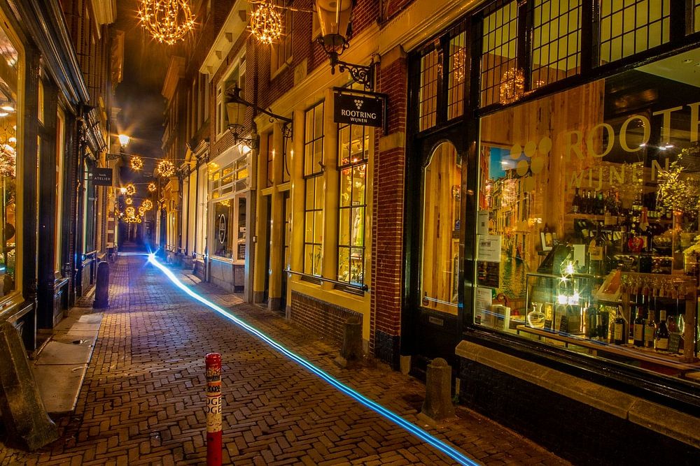 Alkmaar mit seinem alten Stadtzentrum ist immer eine schöne Stadt, die man jedes Mal anders einfangen kann. Sowohl der moderne Turfmarkt als auch die alte Innenstadt bieten reichlich Gelegenheit für schöne Bilder. Die alte Innenstadt mehr mit ihren bunt beleuchteten Schaufenstern und die moderne Stadt mehr mit ihren Spiegelungen und der Innenbeleuchtung, wenn die Leute nach Hause kommen. Hier, dank eines E-Trepps, der vorbeigerast kam.