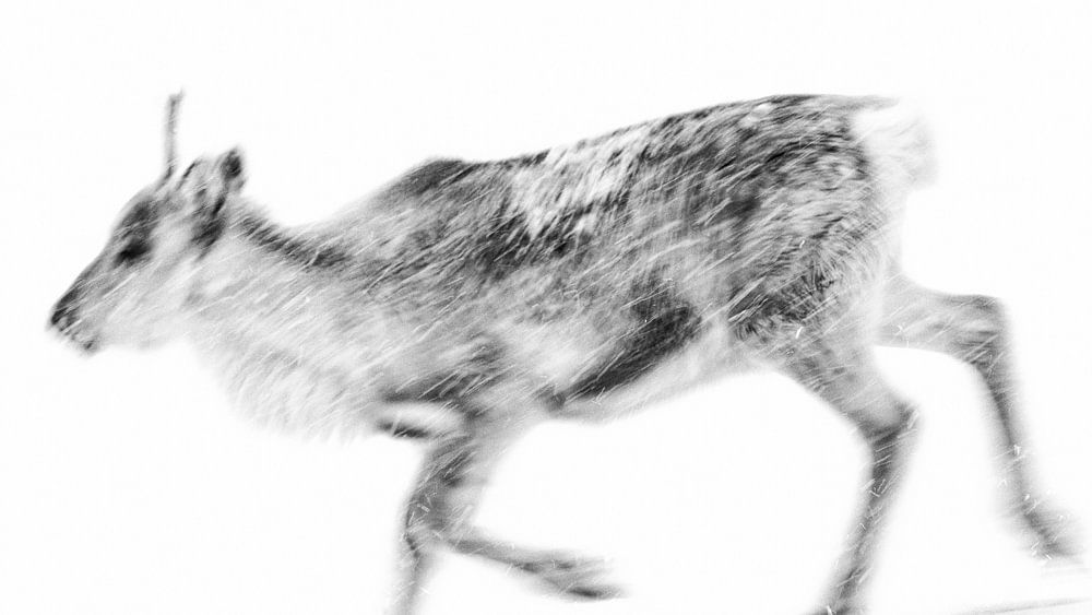 Die Rentiere waren in voller Bewegung, und um diese Dynamik einzufangen, habe ich eine längere Verschlusszeit verwendet. Durch die Umwandlung des Fotos in Schwarz-Weiß erhält das Bild einen fast surrealen, skizzenhaften Look, der die winterliche Atmosphäre oder das Gefühl, das es vermittelt, noch verstärkt.