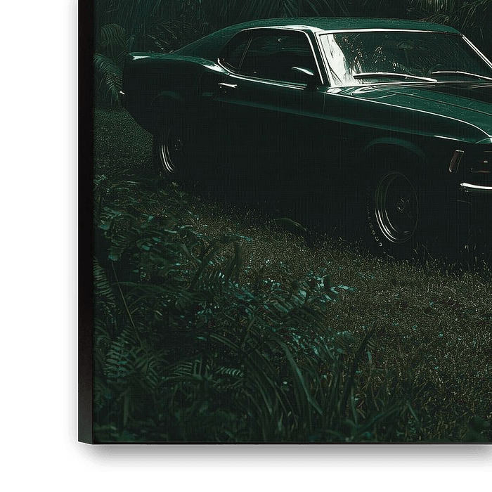 Ein klassischer dunkelgrüner Ford Mustang Fastback, möglicherweise ein Modell von 1969 oder 1970, wird dramatisch beleuchtet, während er in einer dichten, üppigen und dunklen tropischen Dschungelumgebung geparkt ist.
