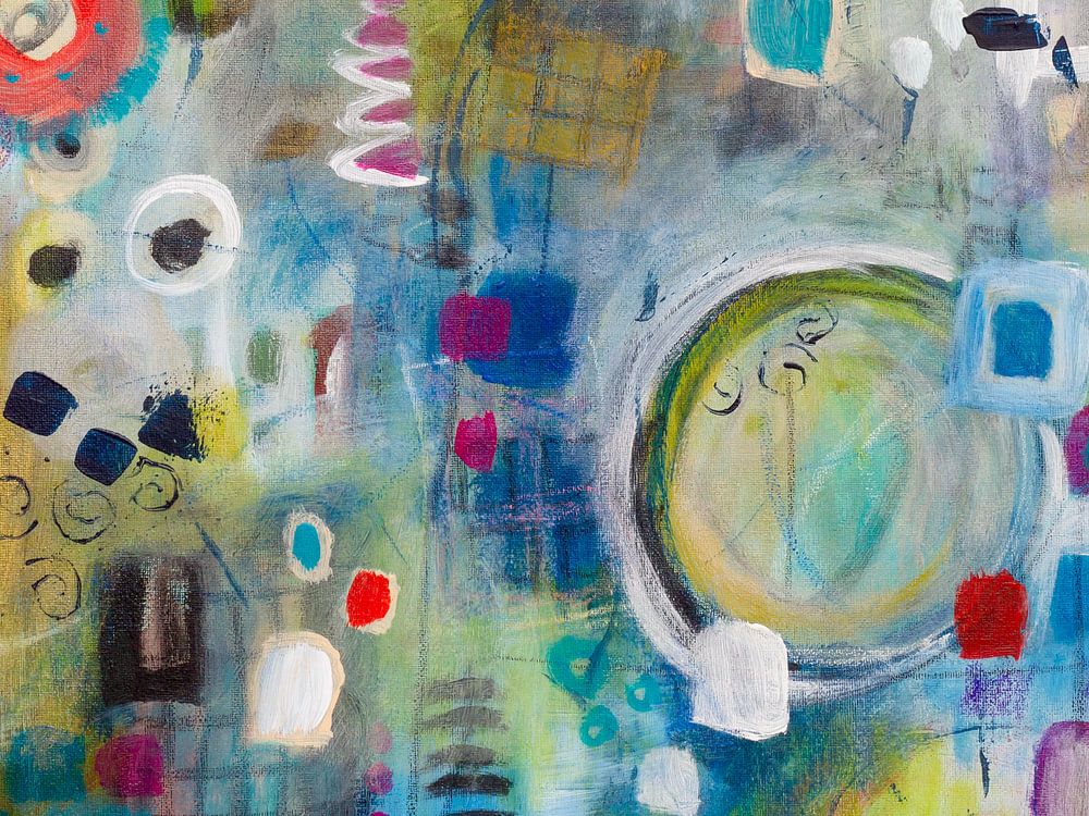 Ein Druck des Originalgemäldes 'Taking Shape', Acrylfarbe auf Leinwand 60x80cm. Dieses Bild ist eine Befreiung der Verspieltheit aus einer erwachsenen Zwangsjacke. Mit leicht gedeckten Farben, ein erster Schritt, die Regeln loszulassen. Eine wiedergeborene Kindlichkeit, die in ihrer ganzen Dynamik da sein kann.
