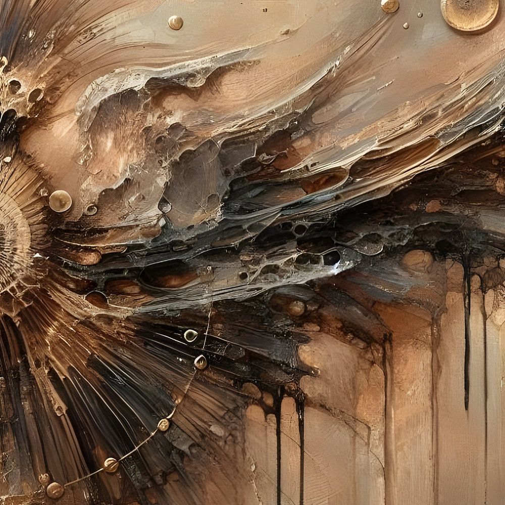 Entdecken Sie die zeitlose Anziehungskraft dieses abstrakten Werks, das von den Formen und Strukturen eines Fossils inspiriert ist. Die komplexen Schichten und Spiralen sind in Erdtönen und subtilen metallischen Akzenten gehalten und erinnern an alte Schönheit und den natürlichen Lauf der Zeit. Die abstrakten Formen fangen die Essenz des Fossils ein, während die Texturen Tiefe und Geschichte suggerieren. Dieses Werk bringt ein Gefühl der Verbundenheit mit der Erde und der Geschichte in jeden Raum, perfekt für Natur- und Kunstliebhaber.