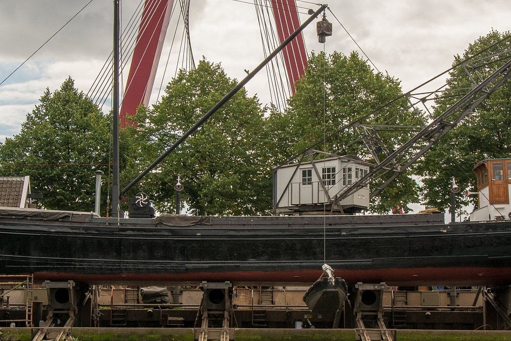 Die Helling Koningspoort befindet sich an der Stelle, an der die Maas früher den Zugang zum Alten Hafen von Rotterdam bildete. An dem Tag, an dem ich vorbeikam, lag ein altes Binnenschiff an der Helling. Mit den schönen Wolken am Himmel darüber und der Willemsbrug im Hintergrund sah ich darin ein schönes Foto.