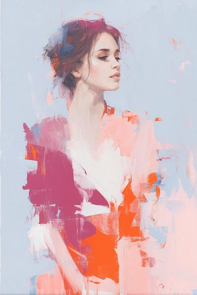 Ein Porträt, in dem sanfter Realismus mit abstrakten Pinselstrichen in warmen Rosa-, Orange- und Burgundertönen verschmilzt. Das Werk fängt einen Moment der Selbstreflexion ein, wobei die weibliche Figur als Anker in einem Strom emotionaler Farbausdrücke dient. Die gemalten Fragmente scheinen Gedanken und Gefühle darzustellen, die sich…