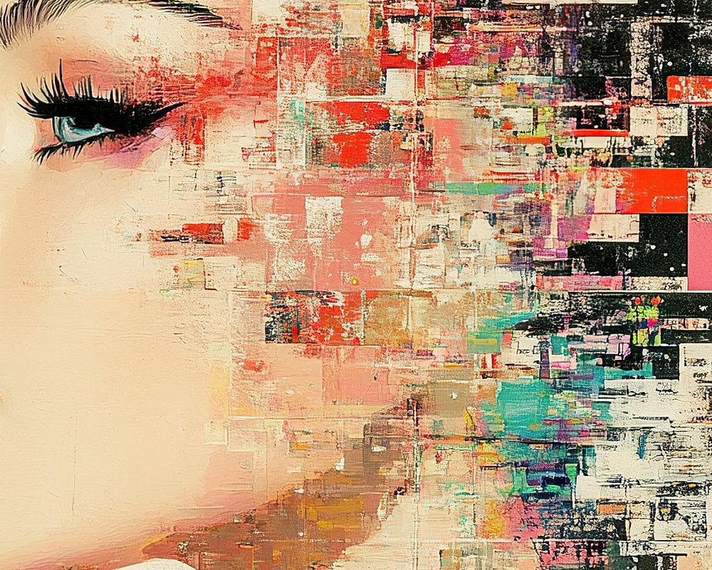 Fragmented Colors of Grace - Dieses digitale Frauenbild zeigt ein weibliches Porträt im Profil mit einem strukturierten Hintergrund aus mehrfarbigen, verwitterten Streifen, die ihr Gesicht teilweise überlagern und einen dynamischen und modernen Effekt erzeugen.