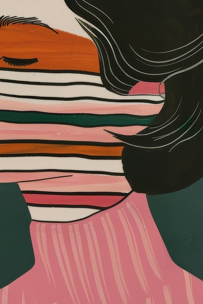 Dieses faszinierende Werk zeigt das ruhige Gesicht einer Frau, die in der Seitenansicht mit geschlossenen Augen dargestellt ist, so als ob sie sich in einem tiefen Zustand der Selbstbeobachtung befindet. Was dieses Porträt einzigartig macht, sind die horizontalen, bunten Linien, die ihr Gesicht und ihren Hals durchziehen und dem Bild ein vielschichtiges, fast abstraktes Aussehen verleihen. Diese Linien symbolisieren die verschiedenen Schichten von Identität, Emotionen und Erfahrungen, die uns prägen, aber oft unter der Oberfläche verborgen bleiben.