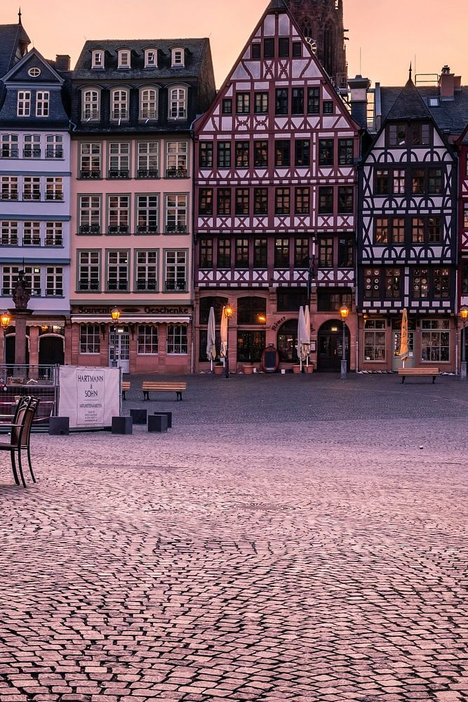 Frankfurter Römerberg mit Stadtwappen zum Sonnenaufgang
