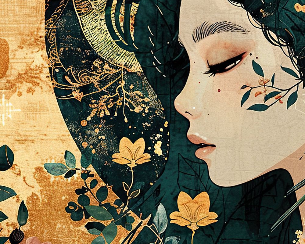 Details: Frau, Portrait, Blumen, modern, künstlerisch, elegant, gold, grün, Natur, blühend