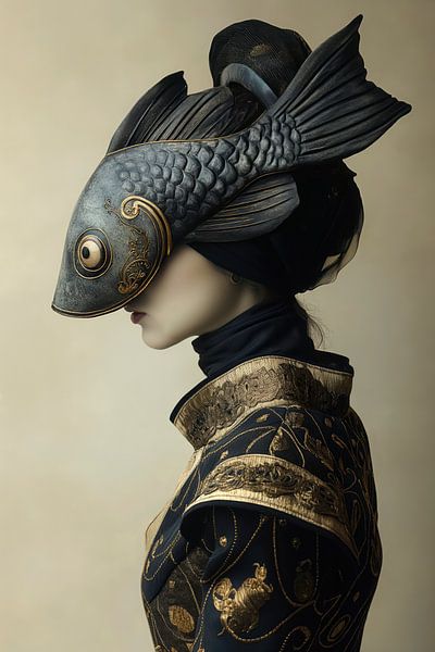 Partret einer klassischen Frau, die einen Fischhut trägt.