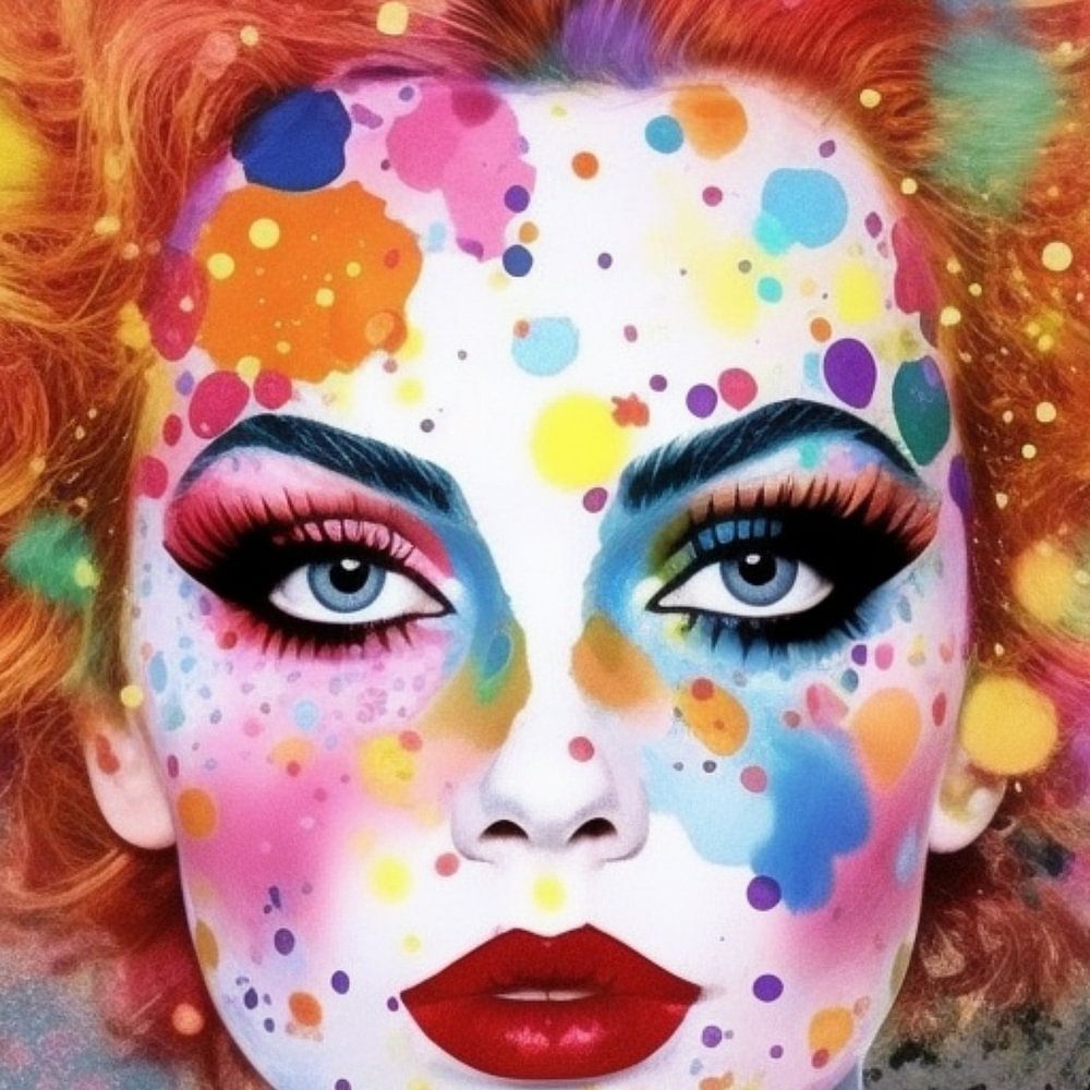Ein farbenfrohes Porträt einer Frau explodiert förmlich vor Lebendigkeit. Das Gesicht ist weiß geschminkt und mit unzähligen, leuchtenden Farbspritzern in Pink, Gelb, Blau und Grün übersät. Das rote, lockige Haar ist wild und voluminös, ebenfalls mit Farbtupfern versehen. Die Augen sind mit dramatischem schwarzen und blauen Make-up betont, die Lippen leuchten rot. Ein großer, bunter Kragen aus Stoffresten umrahmt das Gesicht. Der Hintergrund ist abstrakt und dynamisch, mit weiteren Farbspritzern und Glitzerpartikeln. Die gesamte Komposition strahlt Energie und einen exzentrischen Charme aus.