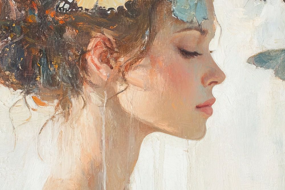Details: Frauenbild, Schmetterlinge, moderne Kunst, Porträt, verträumt, Farben, Frau, Gemälde, bunt, Schönheit