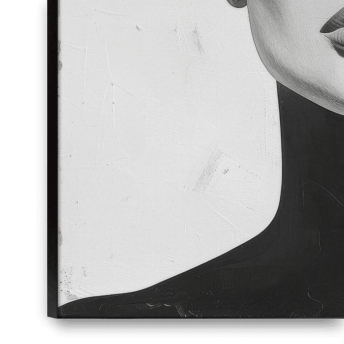 Dieses beeindruckende Kunstwerk fängt die Essenz von Minimalismus durch ein elegantes Frauenporträt in Schwarz-Weiß ein. Die klare Linienführung und der starke Kontrast schaffen ein kraftvolles und dennoch schlichtes Bild, das perfekt zu modernen Wohnräumen oder Büros passt. Die geschlossenen Augen und die leicht geöffnete Lippe…