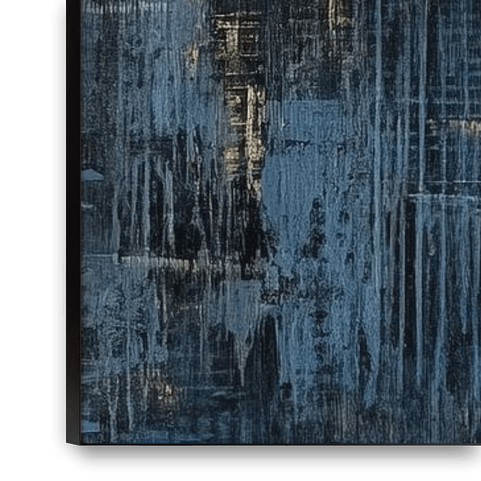 Woman City | Whispering Skyscrapers Night - Diese städtische Frau Gemälde verbindet die heitere Porträt einer Seite Profil Frau mit einer strukturellen Hintergrund der abstrakten, Hochhaus Stadtlandschaften in einer geschichteten Zusammensetzung von Blau-und Goldtönen ausgedrückt.