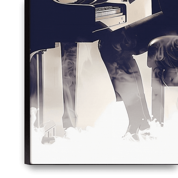 Dieses moderne digitale Kunstwerk zeigt eine faszinierende Szene, in der eine Frau, die als Silhouette und in einem Schwarz-Weiß-Ton dargestellt ist, leidenschaftlich auf dem Klavier spielt. Der Hintergrund, mit einem ausgeprägten Jugendstil, zeigt eine detaillierte Stadtsilhouette, die fast in der Luft zu schweben scheint, was eine…