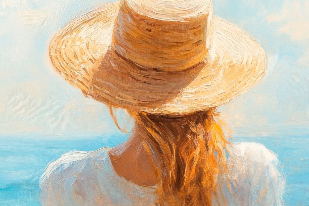 Sanfte Wellen schaukeln in einem unendlichen Blau, während eine Frau mit einem breiten Strohhut in die Ferne blickt. Ihr sonniges Haar fällt sanft über die Schultern, harmonisch vereint mit dem strahlenden Himmel. Die leichte Brise trägt das Versprechen von Freiheit und unvergesslichen Erinnerungen in der Luft. Ein Moment voller Sehnsucht und Ruhe.