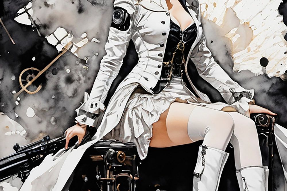 Eine Steampunk-Frau in weißer Lederkleidung sitzt auf einem Motorrad oder einer Maschine und hält eine Waffe in ihrer Hand. Sie sieht sehr sexy und gefährlich aus in ihrer harten weißen Kleidung und ihren hohen weißen Stiefeln. Die Tinte und die Farbe lassen das Bild hart und stilvoll aussehen. Das Bild wurde mit ai erstellt.
