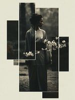 Een vrouw, gekleed in een traditionele kimono, staat elegant te midden van kersenbloesems die in een geometrisch patroon zijn verweven. De ingetogen kleuren roepen een gevoel van nostalgie en rust op.