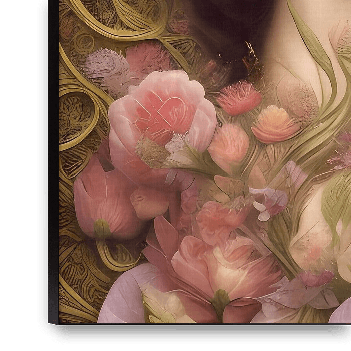 Bestelle dieses Vögel Wandbild Frau im Stil Art Nouveau mit rosa Rosen von Rosa Piazza als Reproduktion auf Leinwand, Alu-Dibond, als Poster, Fototapete, ArtFrame oder Acrylglasbild, maßgefertigt in höchster Qualität.