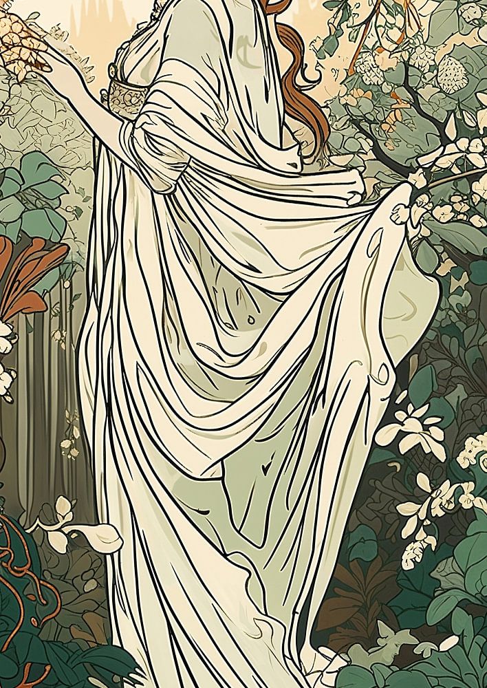 Frau im üppigen Garten, im Stil von Alphonse Mucha
