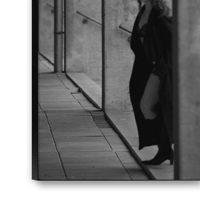 In der kühlen Umgebung von Beton die subtile Unterbrechung. Das begrenzte Licht schiebt die Frau hinein, der Schatten zieht das Licht heraus