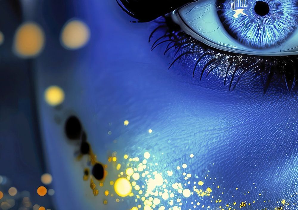 Diese künstlerische Darstellung zeigt eine Frau, deren Körper kunstvoll mit blauem und goldenem Körperbemalung verziert ist. Ihre Haut schimmert im Licht, wobei das Blau und Gold eine faszinierende Harmonie schaffen. Besonders hervorstechend ist ihr durchdringendes, strahlend blaues Auge, das fest auf die funkelnden, goldenen Bokeh-Lichter gerichtet ist, die den Hintergrund ausfüllen. Die Bokeh-Lichter erzeugen eine traumhafte, fast magische Atmosphäre und reflektieren auf der glänzenden Körperbemalung der Frau. Diese Komposition bringt eine Mischung aus Eleganz und Mystik zum Ausdruck und schafft eine intensive visuelle Erfahrung. Die Kombination aus den kühlen Blautönen und den warmen Goldnuancen vermittelt ein Gefühl von Luxus und Raffinesse. Diese Szene könnte symbolisch für die Verbindung zwischen Körper und Geist stehen oder einfach die Schönheit und Vielfalt künstlerischer Darstellung feiern. Ideal für Projekte, die Themen wie Schönheit, Kunst, Luxus und mystische Anziehungskraft verkörpern möchten.