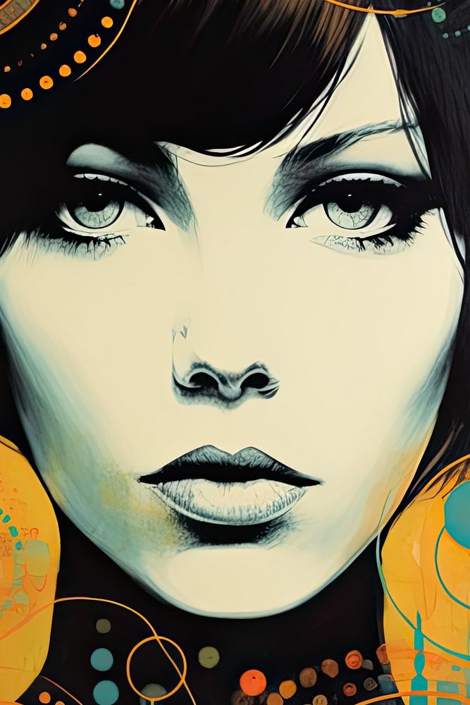 Gesicht einer Frau aus den 1960er Jahren in Mischtechnik mit vielen Farben