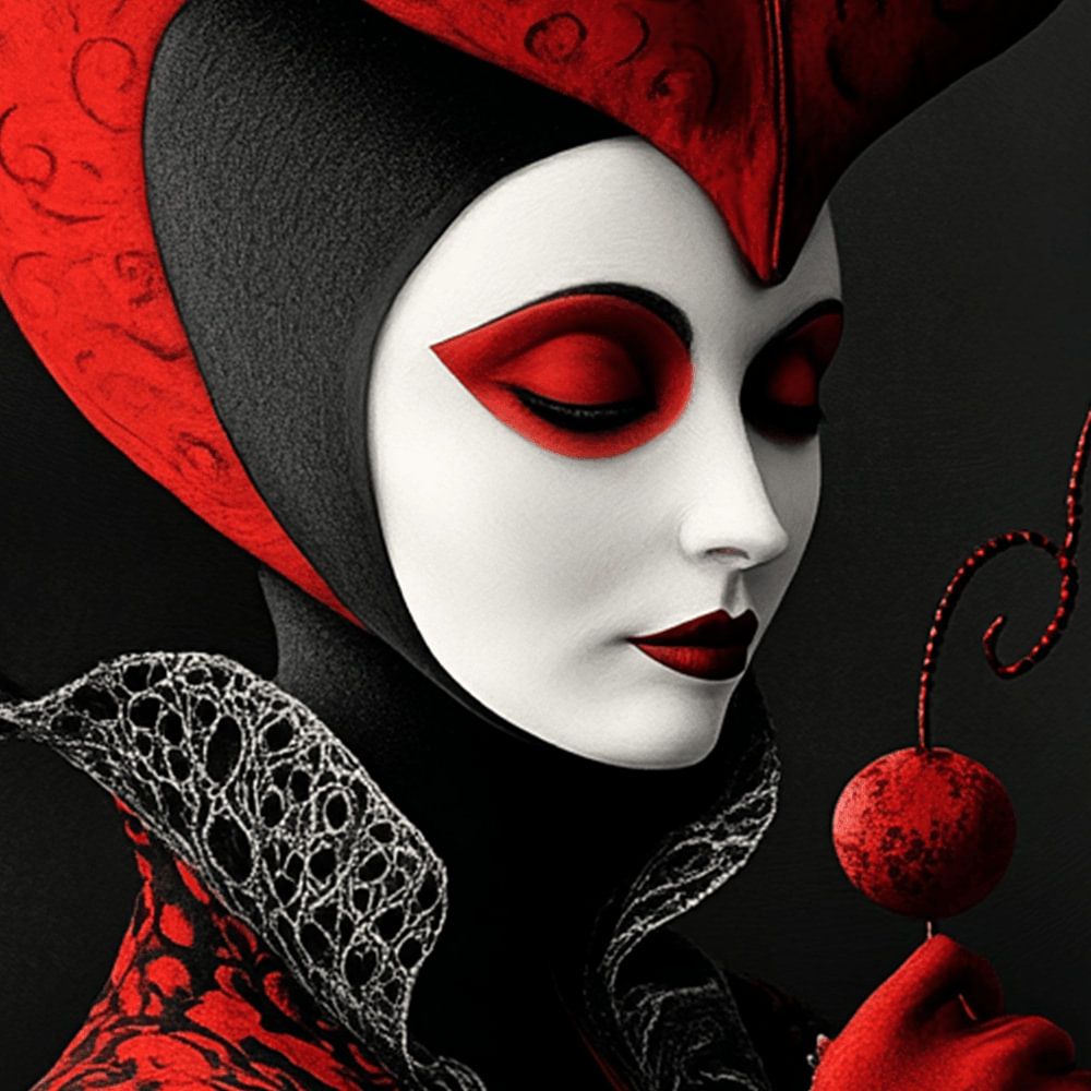 Diese geheimnisvolle Dame ist eng in Rot und Schwarz gekleidet, mit einem markanten herzförmigen Kopfschmuck und weiß geschminkter Haut. Ihre Augen sind geschlossen, ihre Haltung ist anmutig und kontrolliert. Alles an ihr strahlt Stil, Macht und Geheimnis aus.