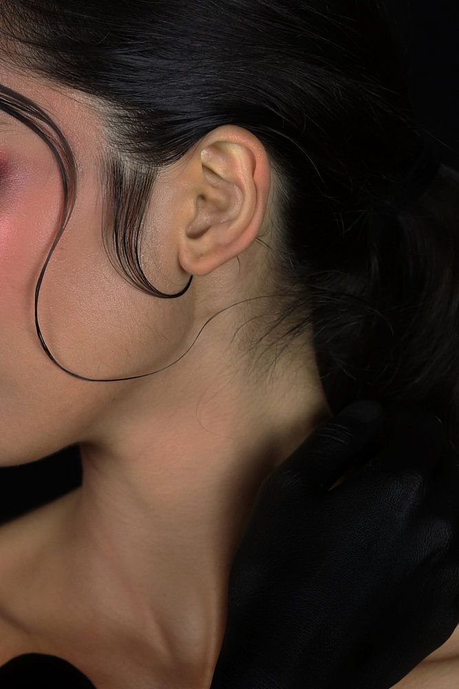 Frau in Schwarz mit rosa Metall-Make-up. Sie hat ihre Augen geschlossen und sieht friedlich aus.