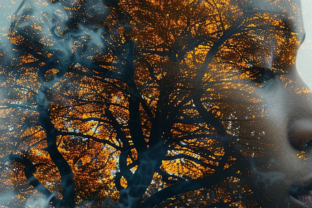 Mehrfachbelichtung in Photoshop mit AI von Frau mit Waldszene erstellt