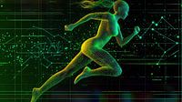 Diese Illustration zeigt eine futuristische Drahtgitter-Frau, die mit hoher Geschwindigkeit durch den Cyberspace läuft. Sie ist umgeben von leuchtenden grünen und gelben Partikeln, die die Dynamik ihrer Bewegung und die technologische Entwicklung symbolisieren. Die Drahtgitter-Darstellung der Frau betont die Verschmelzung von Mensch und…
