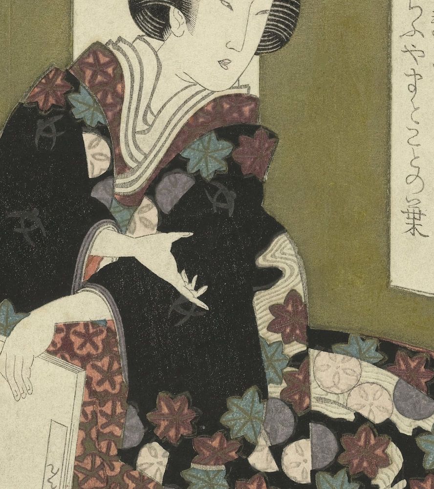 "Frau kniend vor einem Bücherstapel, in der Hand das Buch Die Blume des Ostens (Hana no en). Im Hintergrund ein Paravent mit zwei Gedichten und ein Gemälde mit Bambus. "Ein Surimono ist ein luxuriöser Druck, bei dem ein Bild mit einem oder mehreren Gedichten kombiniert wird. Beim Druck eines Surimono wurden häufig dickeres Papier, Blindprägungen und Metallpigmente wie Kupfer- und Silberpulver verwendet. Die Drucke wurden oft von Dichtern in Auftrag gegeben und als exklusive Geschenke an Freunde und Verwandte verschenkt." Rijksmuseum Amsterdam Farbholzschnitt Ukiyo-e Vermächtnis von J.A. Bierens de Haan, Amsterdam