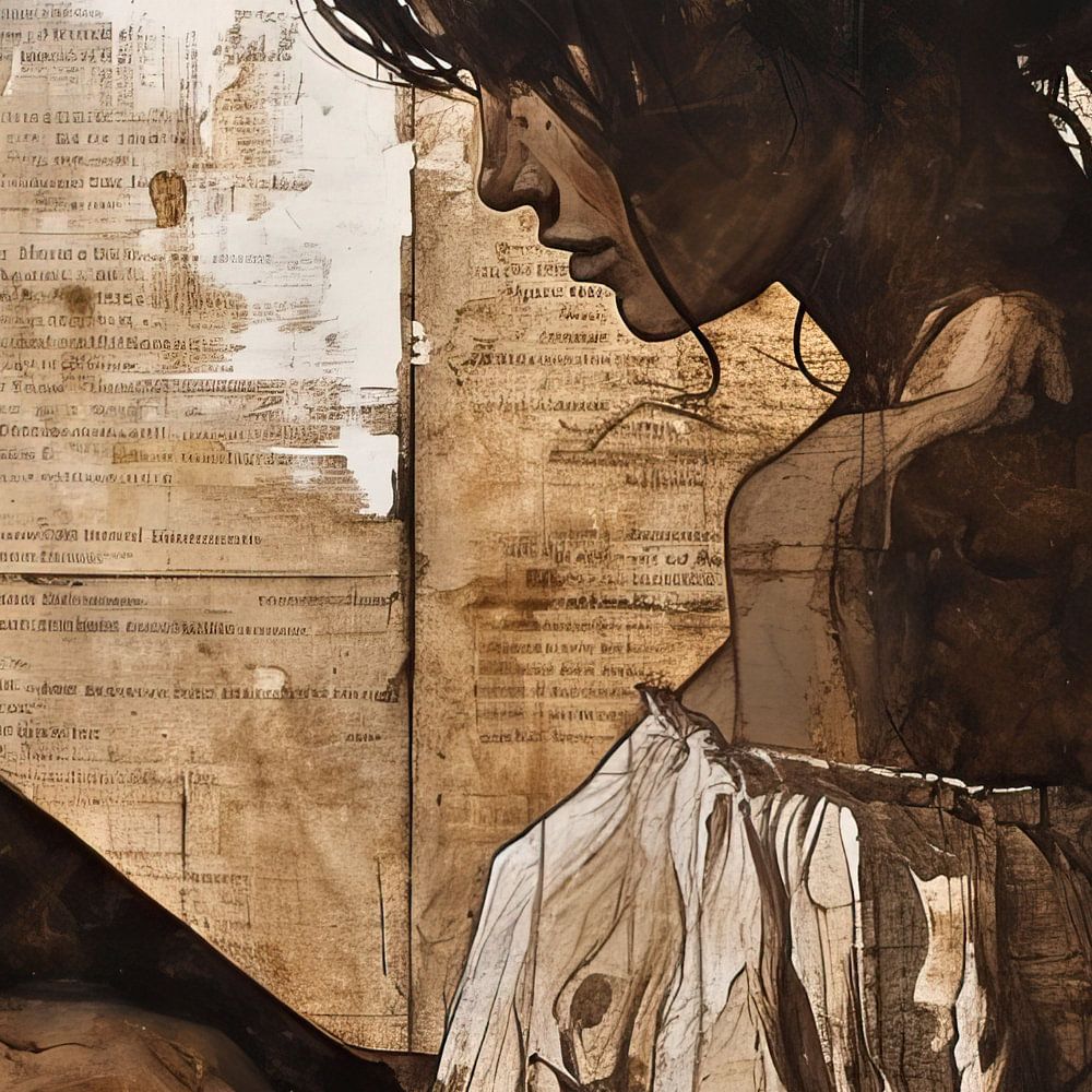 Frau mit Buch - Vor uns liegt ein Gemälde, das, mit der Schönheit der monochromen Palette spielend, eine in ein Buch vertiefte Frau zeigt. Der Hintergrund, eine Collage aus Textseiten, verschmilzt mit ihrer Figur und führt zu einem fesselnden Spiel aus Figur und Abstraktion. Gedämpfte Braun- und Beigetöne dominieren die Leinwand, unterbrochen von den geschwärzten Umrissen, die die Formen definieren.