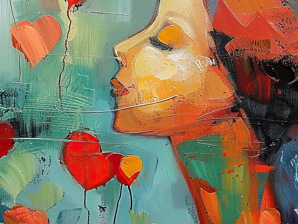 Details: Frau, Herzen, abstrakt, bunt, Liebe, Emotionen, stilvoll, modern, Gemälde, Kunst