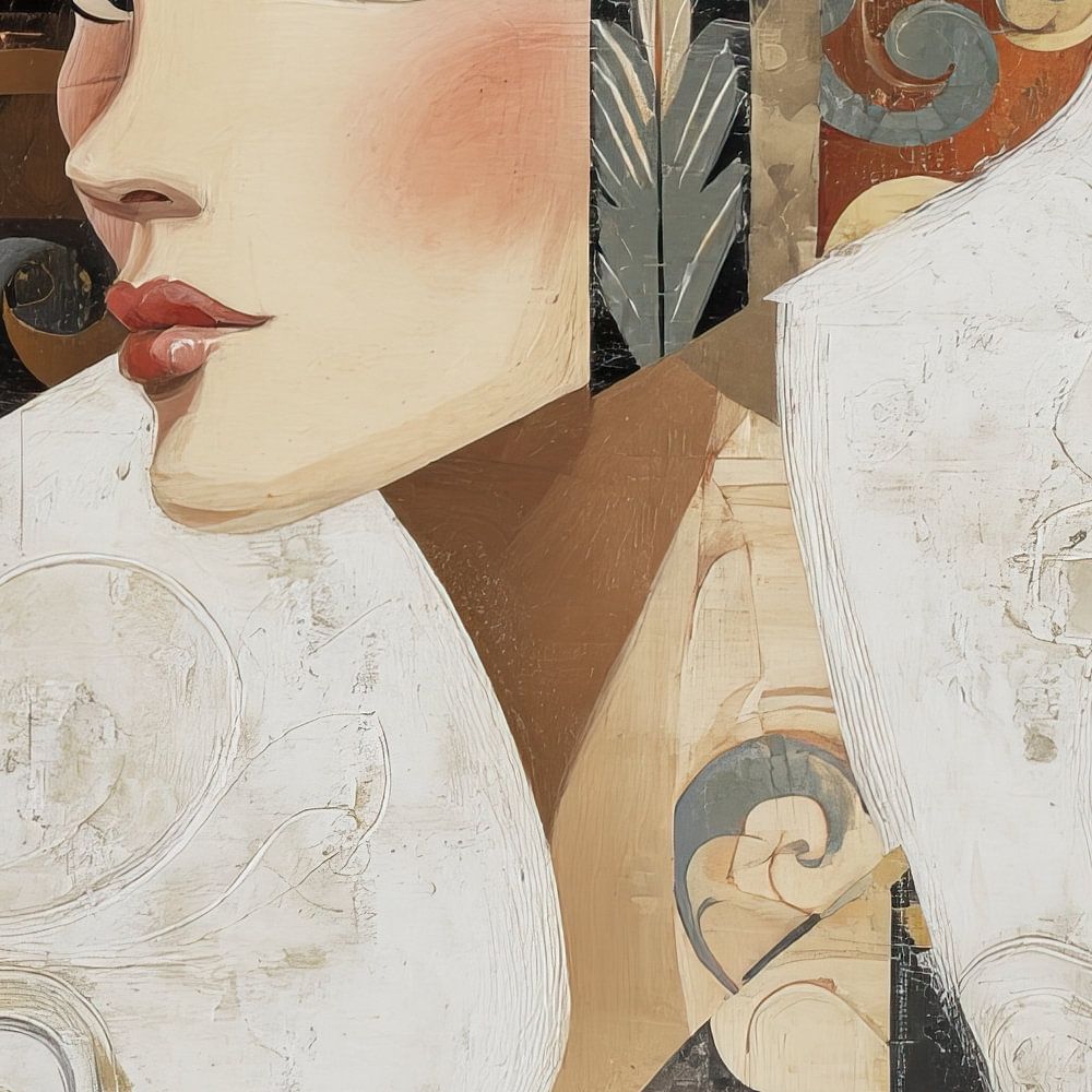 Details: Frau, Porträt, modern, abstrakt, Hut, schwarz, braun, grau, weiß, beige