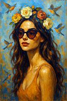 Bestelle dieses Blumen-Wandbild Frau mit Sonnenbrille malt. von Johannes als Reproduktion auf Leinwand, Alu-Dibond, als Poster, Fototapete oder Acrylglasbild.