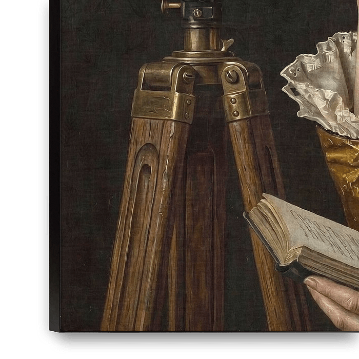Dieses raffinierte Kunstwerk zeigt eine junge Frau, die konzentriert und ruhig durch ein antikes Kupferfernrohr blickt, während sie ein kleines offenes Buch in der Hand hält. Die Szene strahlt die Atmosphäre klassischer Malerei aus und weckt Assoziationen zum Barock und zur Frühzeit wissenschaftlicher Entdeckungen.