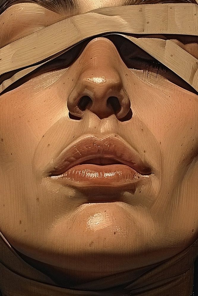 Dieses faszinierende Design zeigt eine geheimnisvolle Frau mit Verbänden über den Augen, die ein Gefühl von Geheimnis und Intrige hervorrufen. Die Verwendung von sanften Braun- und Beigetönen in Kombination mit dem dunklen Hintergrund unterstreicht den ruhigen und kontemplativen Ausdruck des Motivs. Dieses Kunstwerk mit seinem surrealistischen Stil und der monochromen Farbgebung eignet sich perfekt für moderne Innenräume und kann einen interessanten Blickpunkt in jedem Zimmer bilden. Es wirft Fragen auf und lädt den Betrachter ein, über die Bedeutung und die Geschichte hinter dem Bild nachzudenken. Eine einzigartige Ergänzung Ihrer Kunstsammlung, die mit Sicherheit zu Gesprächen anregt.