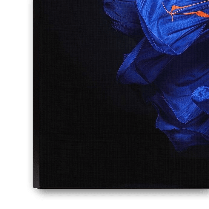Das Bild zeigt eine Frau mit blauer Haut und aufgefächertem Haar, umgeben von blauem und schwarzem Stoff mit orangefarbenen Akzenten, vor einem dunklen Hintergrund.
