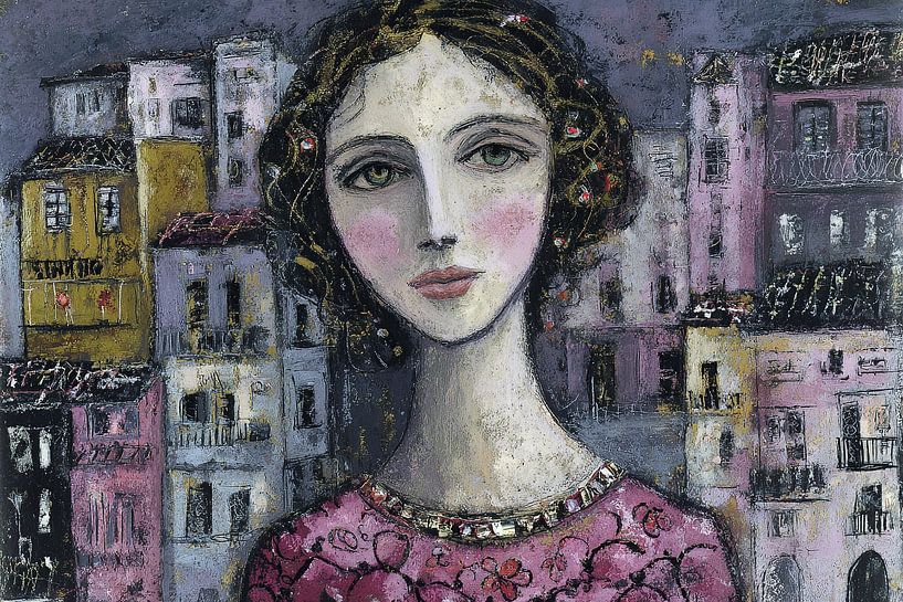 Details: Frau, Mittelmeer, Gebäude, rosa, farbenfroh, Gemälde, Porträt, Frauengemälde, Kunst,…