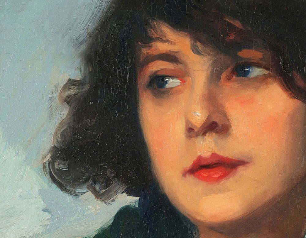 Frau mit grünem Schal, Eugène Cyprien Boulet (1927) Ein Ausschnitt aus dem Originalgemälde. Dieser Ausschnitt konzentriert sich auf das beeindruckende Porträt.