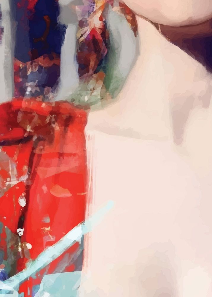 Das Bild zeigt eine Frau mit langem, dunklem Haar, die ein weißes Hemd mit Knöpfen und eine schwarze Hose trägt. Sie sitzt auf einer Couch, hat die Augen geschlossen und den Kopf nach hinten geneigt. Ihre Lippen sind in einem kräftigen Rot gehalten, das einen auffälligen Kontrast zu den Schwarz- und Weißtönen des restlichen Bildes bildet. Der Hintergrund ist ein schlichtes Weiß, so dass die Frau im Mittelpunkt steht.