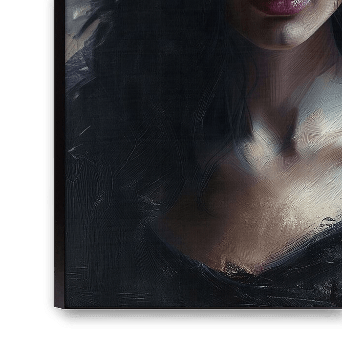Der Hintergrund ist abstrakt und strukturiert, wodurch die Figur in den Mittelpunkt gerückt wird. Der Einsatz von Licht und Schatten verstärkt die dreidimensionale Qualität des Gesichts, während die Konturen der Gesichtszüge weich und suggestiv bleiben. Die Kombination von Stil und Technik ist eine moderne Interpretation der klassischen Porträtmalerei.