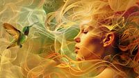 Bestelle dieses abstrakte Wandbild Frau mit schwebendem Kolibri von Frank Heinz als Reproduktion auf Leinwand, Alu-Dibond, als Poster, Fototapete oder Acrylglasbild.