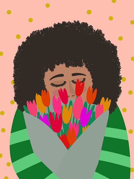 Bestelle dieses Blumen-Wandbild Frau riecht frischen Tulpenstrauß von Sam Soesbergen als Reproduktion auf Leinwand, Alu-Dibond, als Poster, Fototapete oder Acrylglasbild.