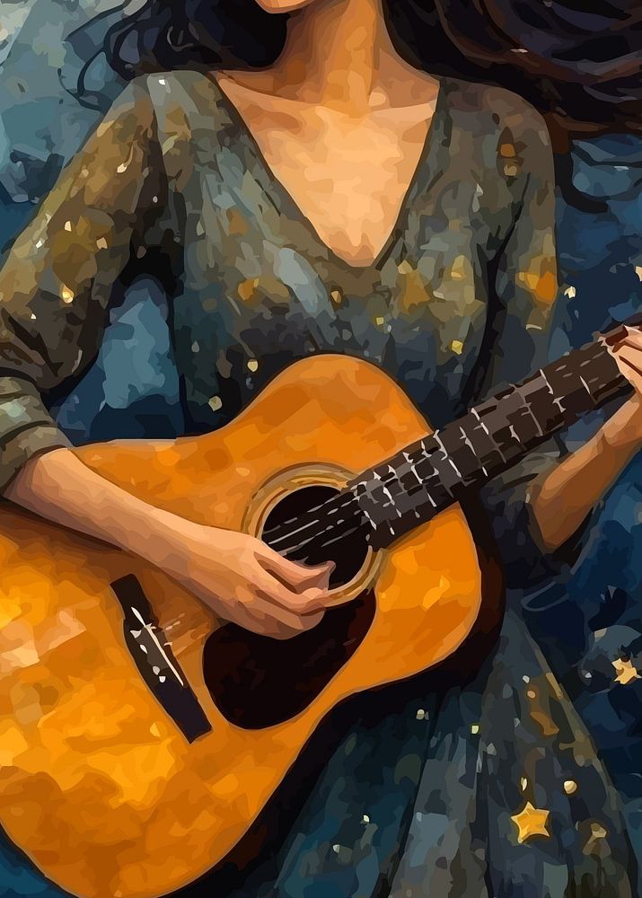 Dieses Porträt strahlt eine ruhige Kraft aus, während eine Frau unter einem malerischen Himmel mit wirbelnden Bewegungen auf der Akustikgitarre spielt. Inspiriert vom Geist der Sternennacht kräuseln sich die Anschläge nach außen wie Akkorde, die sich im Kosmos auflösen. Ihre Präsenz ist ruhig und kraftvoll zugleich, ihr Spiel verschmilzt mit dem Rhythmus des Universums. Das Kunstwerk fängt die Wärme und Intimität der akustischen Musik ein und umgibt sie mit einer unendlichen Atmosphäre, so dass ein zeitloses Herzstück aus Kunst und Klang in Harmonie entsteht.