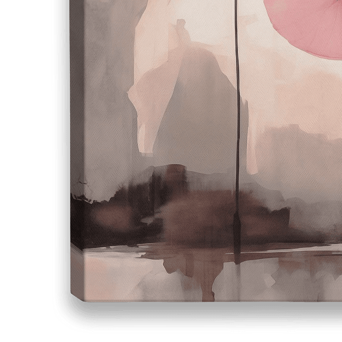 Abstrakte Skizze in japanischen Atmosphären. Frau am Teich mit Seerose. Weiche warme erdige Töne. Zartrosa runde Formen.