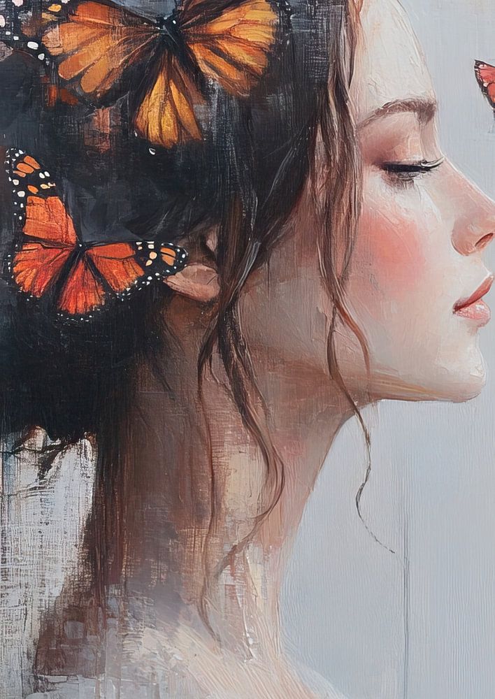 Details: Frauenbild, Schmetterlinge, verträumt, modern, Kunst, Farbe, Porträt, Frau, Malstil, Inspiration