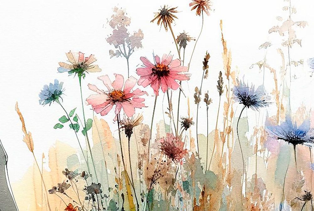 Aquarell einer Frau, die zwischen Wildblumen spazieren geht. Sie trägt einen Mackintosh und einen großen Hut auf dem Kopf. Ein surreales Bild, unwirklich, seltsam und bizarr. Das Bild wurde mit ai erstellt.