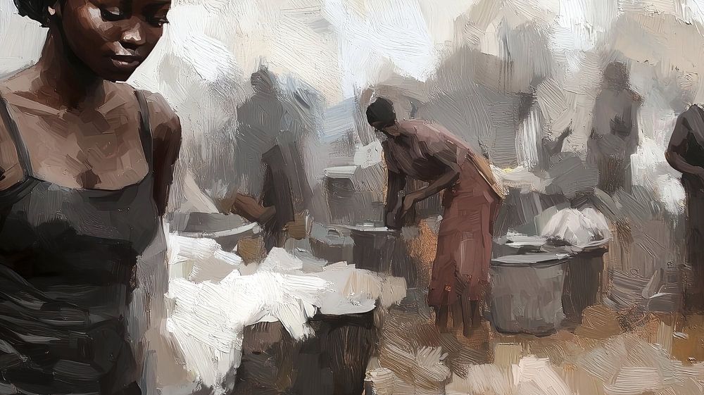 Einfühlsame Szene von Frauen, die gemeinsam im Freien Kleidung in großen Becken waschen. Die Illustration zeigt den harten Alltag und die Zusammengehörigkeit in einem Entwicklungsland. Die warme Farbpalette und die detailreiche Darstellung betonen den Gemeinschaftssinn und die Resilienz der Frauen.