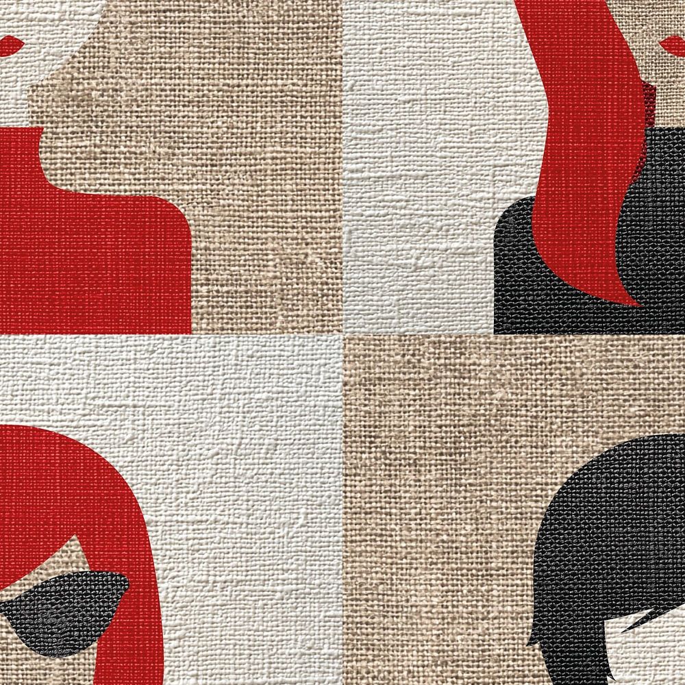 Vier stilisierte weibliche Porträts, jedes in einer eigenen Ebene auf einem Raster von zwei mal zwei. Jede Figur hat eine einzigartige Frisur und eine klare Farbgebung, bei der Schwarz, Rot und Weiß dominieren. Die Textur des Hintergrunds erinnert an Leinen oder Sackleinen und verleiht dem ansonsten grafisch-strengen Bild eine warme, textile Note.